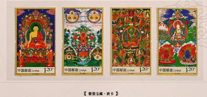 唐卡邮票上的图案选取了藏传佛教中最为常见的、最具代表意义4位佛像,表现出西藏传统唐卡文化的精华。这套邮票是中国首次将唐卡绘画元素运用到邮票创作中,极具收藏价值。
