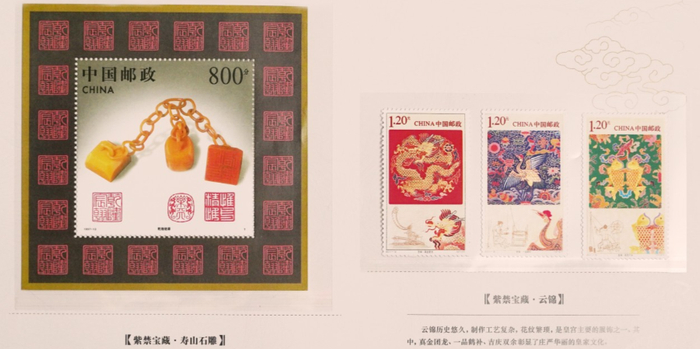 寿山石雕邮票中的“乾隆链章”是故宫博物院内所藏、溥仪捐献的带链田黄石印章(乾隆遗物),被视为“宫中瑰宝”,难得一见;云锦邮票上的图案云锦被公认为“东方瑰宝”、“中华一绝”,是中华民族和全世界最珍贵的历史文化遗产之一。