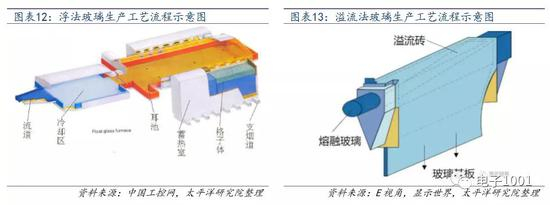 1. 前道:当前,主流的玻璃制备方法包括浮法和溢流法两种:(1)浮法,是将玻璃熔液倒至装有熔解锡的缸内,玻璃熔液浮于锡面,自然而然形成两面平滑的表面,最后慢慢冷却并成长为带状离开锡缸;(2)溢流法则是将熔融的玻璃膏输送至熔融帮浦的中心,再利用溢流的方式,将两股向外溢流的玻璃膏于帮浦的下方处结合成平板玻璃。
