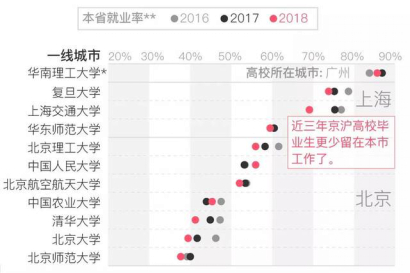 澎湃新闻“美术课”栏目通过梳理一流大学建设高校《2016/2017/2018年度毕业生就业质量报告》发现:2016年-2018年,京沪“一流高校”毕业生更少留在本地工作。