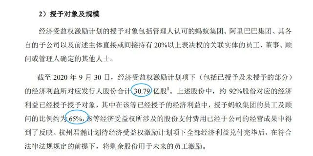 10月26日蚂蚁的招股书显示,经济受益权激励计划项下的经济利益所对应发行人股份合计30.79亿股,这里其中有约65%的股份是授予员工及顾问。
