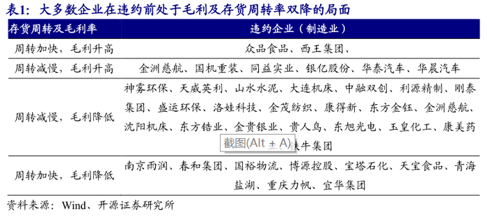 历史上 ,大多数 企业在违约前 处于毛利及存货周转率双降的局面 。这些企业无论是主动还是被动降低毛利,其存货周转率都在下降,从这一量价关系看,这些企业的产品存在吉芬商品之嫌:即使进行存货甩卖,存货的变现也是困难的。此外,违约案例中次多的情况是周转加快、毛利降低,这些企业可能在违约前进行了主动存货处置,且存货的价格弹性发挥了一些作用。