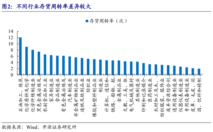 通常来说, 存货周转率和周转天数是我们度量存货变现能力的粗略指标。造成企业之间存货周转率的主要因素之一是行业的差异,由于制造工艺及行业特点差异较大,往往各行业周转率存在很大不同。一个大体的规律是:上游行业(石油加工、黑色金属冶炼、有色金属冶炼)及下游行业(农副食品加工、汽车制造、造纸、家具及食品制造)的存货周转率容易偏高,而中游行业(专用设备、仪器仪表、通用设备)的存货周转率则容易偏低。