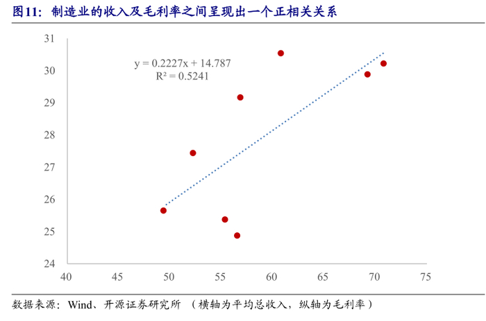 毛利率和收入之间的相关关系是评估存货变现能力的一个角度。纵向比较来看,制造业的收入及毛利率之间呈现出一个正相关关系,其原因是随着货币储蓄的增加,制造业的收入和利润都会同步扩张。如果在这一过程中,利润扩张偏快的企业或产品意味着偏强的竞争力,一个对此进行量化观察的方法是毛利率与收入的线性回归曲线的斜率。