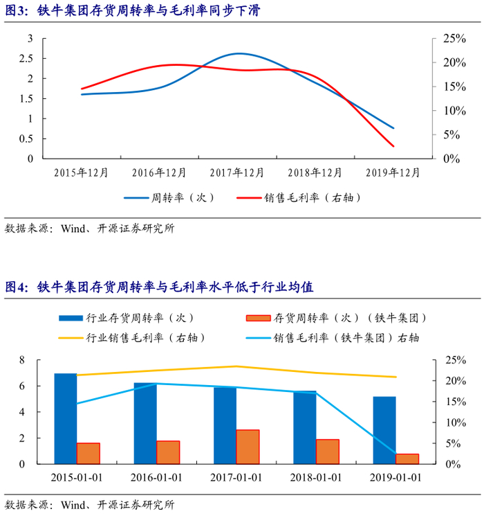 铁牛集团有限公司2015-2019年存货周转率与毛利率同步下滑,特别在2018、2019年间,毛利率曲线下降斜率骤然陡峭,降至不足3%。同时,对比行业,铁牛集团无论存货周转率或者毛利率水平,均大幅低于行业均值,产品严重滞销。进一步观测其他财务指标,也均处于行业底部位置。该公司于2020.08.24首次出现违约。