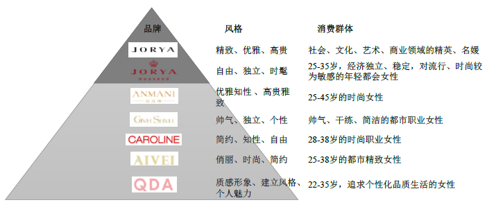 牌在定位、设计风格、目标客户等方面既有差异,又形成互补和延伸,目标客户群体包括了18-45 岁年龄段的主力消费人群,覆盖中高端品牌女装市场,形成了对女装市场多维度、深层次的渗透。