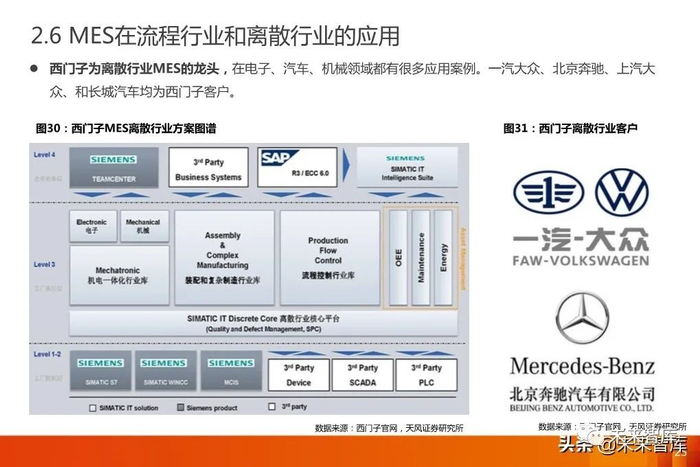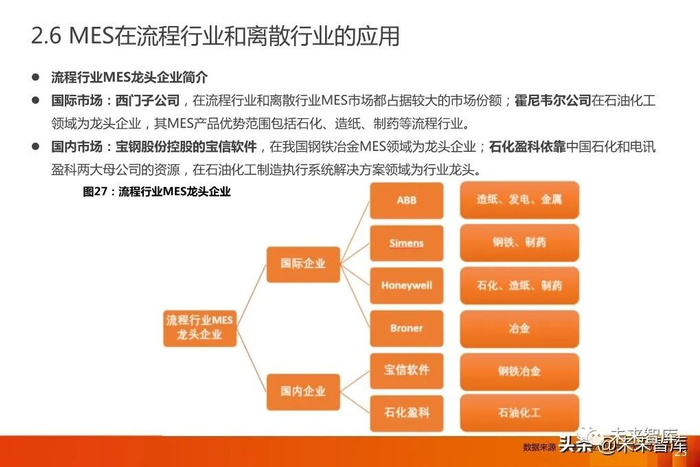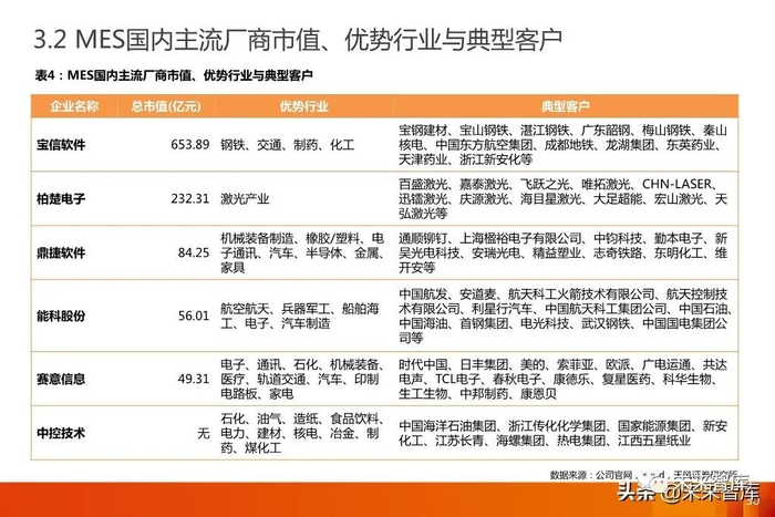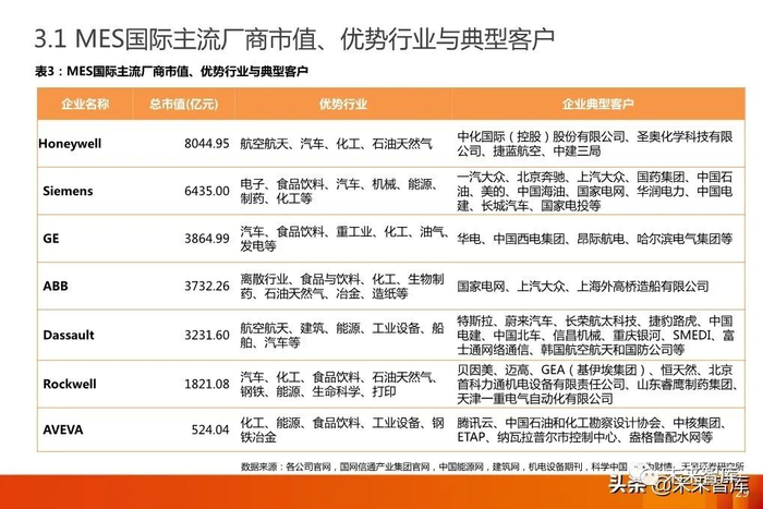 国外的MES产业起步时间早、发展快,增长迅速,出现了Siemens、GE Fanuc、Rockwell等一批龙头企业。随着国内 MES产业逐渐成熟,将会有一批龙头企业逐渐浮现。