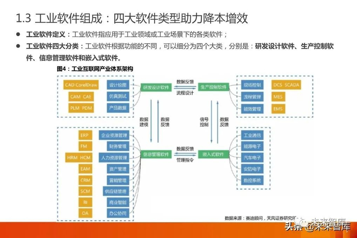 工业软件作为工业互联网核心产业增长的驱动力量, 国内市场规模达近2300亿。制造执行系统(MES)在四大工业 软件之一的生产控制软件中市场占比最高,达到近29%,是工业软件行业不可或缺的重要软件系统。