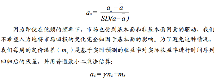 因为我们正在寻找市场实际水平与基本面之间的偏差,所以我们决定从时间序列的维度进行观察,因此我们计算每周的定价误差的指数加权移动平均值,半衰期为8周。