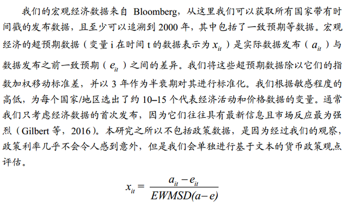 3、作者首先使用事件研究的方法对日内价格的表现与标准化后的宏观超预期数据进行了回归,从而估计资产价格对宏观信息的反应系数;接着基于反应系数实时预测宏观基本面所驱动的市场收益率,并定义了一种衡量定价误差的新方法,该计算方法基于市场收益与宏观信息预期水平的差异,从而能获得非基本面因子对市场的影响情况。