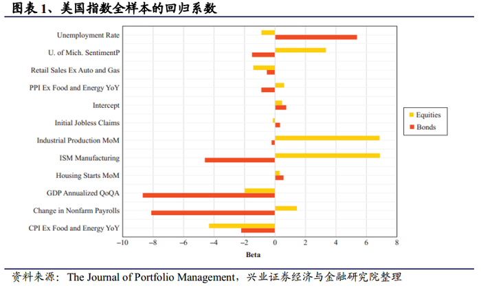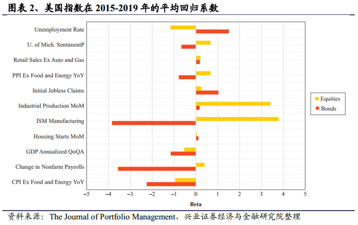 图表1展示了美国指数全样本的统计结果,图表2展示了2015-2019年的平均系数。若ISM Manufacturing这种顺周期经济指标的超预期数据为正,往往会引起股票价格上涨和债券价格下跌;若失业率等逆周期指标的超预期数据为正,将导致债券价格上涨和股票价格下跌;通胀膨胀冲击对债券价格的影响较大。