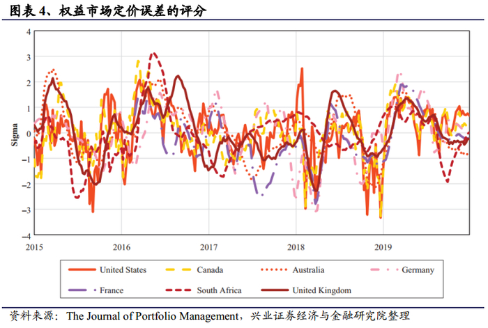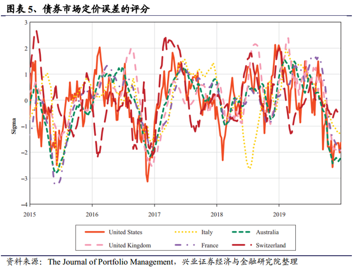 图表4和图表5分别展示了股票和债券市场的定价误差的评分。我们发现无论是股票市场还是债券市场,各个国家之间定价误差的评分通常是密切相关的,但是这种相关性的强度随时间而变化,这表明全局因素和特异因素的相对重要性在随着时间变化。由于定价误差评分是具有八周的半衰期的指数加权平均值,因此剧烈的走势变化需要一定的时间才能在系统中发挥效果。
