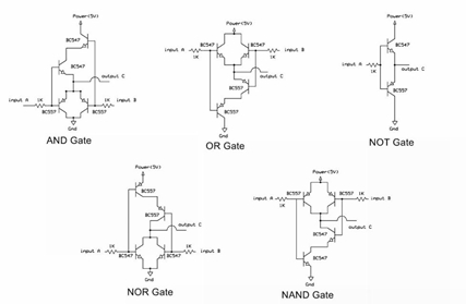 下图就是用晶体管实现各类数字逻辑门的例子,输入比特(input A,B)作为电压可以控制输出比特(output C)的值。