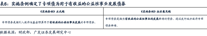 此外,实施条例的颁布也确定了专项债的准确定义:用于有收益的公益性事业发展的专项债券。由于新《预算法》中并未对专项债务作出定义,实施条例需要对其作出进一步阐释。在实施条例征求意见稿中,专项债务的释义为“为有收益的公益性事业的发展举借的债务”,也于今年的正式稿基本确定。