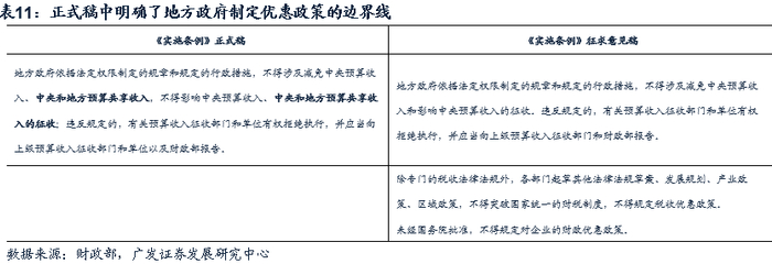 两相对比,正式稿中一是删去了对各部门制定财税优惠政策的明确禁止令,保留了调整空间;二是更加清晰地界定了地方行政法规的禁区(“涉及中央预算收入、中央和地方预算共享收入”),方便地方政府制定相应税收优惠政策。