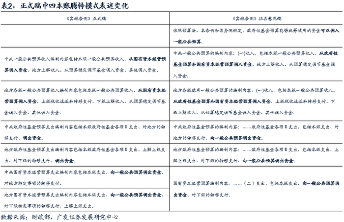 (三)细节方面,《实施条例》正式稿较六年前征求意见稿表述出现多处改动,其中部分与六年来的财政变化息息相关,也从政策层面反映了各项财政工具的细微变化,进而对未来财税体系产生影响。例如——