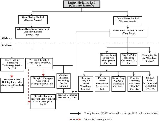 2014年,陆金所进行一系列重组,并于同年12月在开曼群岛注册成立控股公司。下图显示了本次发行完成后的公司结构,包括其重要子公司和VIE,假设承销商没有行使购买额外美国存托凭证的选择权。