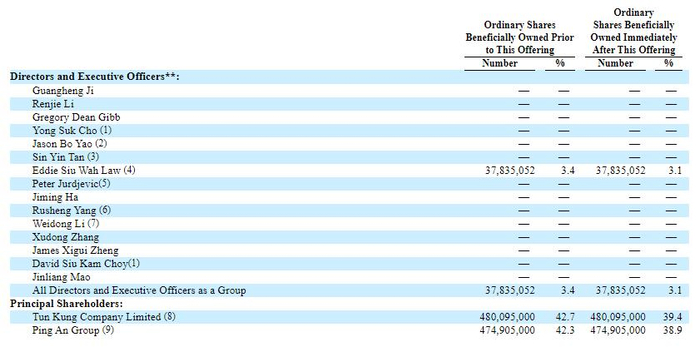 在主要股东中,公司管理层持有3.4%的股份,平安集团持有公司42.3%的股份, Tun Kung Company Limited持有公司42.7%的股权。在IPO之后,公司管理层股权缩至3.1%, 平安集团持有公司38.9%的股权, Tun Kung Company Limited持有公司39.4%的股权。
