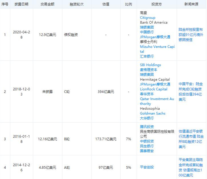 据天眼查数据,在IPO之前,陆金所总共完成了包括债券融资的四轮融资。其中投资方包括腾讯、民生。国泰君安,摩根大通、汇丰、高盛、中国银行等知名机构。其中C轮陆金所获得了合计14.11亿美元的融资,投资方包括春华资本、卡塔尔投资局、摩根大通等多家明星投资机构。融资估值也达到394亿美元。