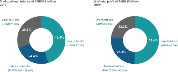 针对高质量借款人:拥有金融资产,房地产或可以使用商业银行信贷的优质借款人,但仅限于在线的TechFin公司和中国的传统金融机构所提供的服务不足。较大规模的票务贷款通常可提供更大的规模经济效益和更有吸引力的客户生命周期价值,这使这些客户成为我们的有吸引力的细分市场。中型至大型机票贷款产生约77%的税前总额零售信贷市场的利润。由于大票额,小企业主贷款空间周围的高准入门槛,我们享有市场领导地位,高利润率和有限的直接竞争。
