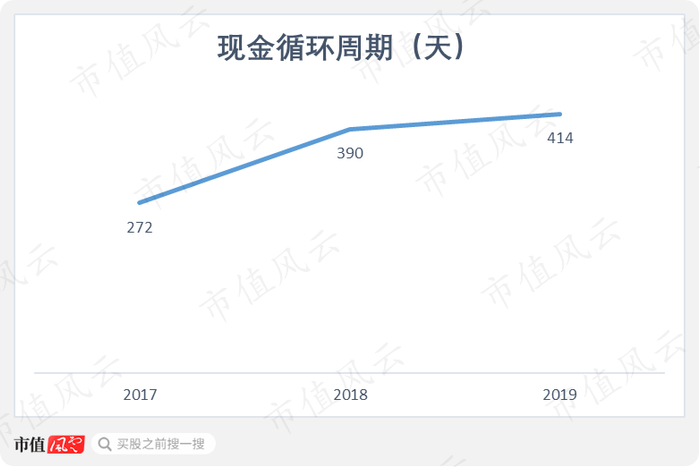 2017-2019年,公司现金循环周期在延长,由272天延长到414天,显示公司的运营效率在降低。限于公司目前的规模,还很难做到对上下游的有效占款。