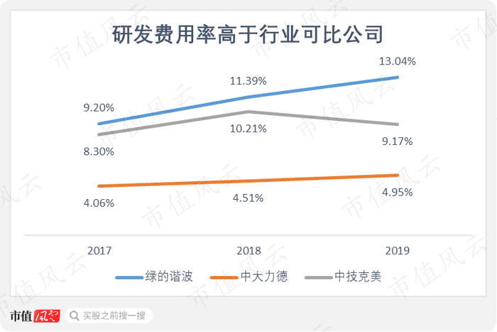 横向对比来看,2017-2019年,公司的研发费用率持续高于同行业两家可比公司。2019年,公司研发费用率为13%,而中技克美和中大力德的研发费用率则分别为9%和5%。