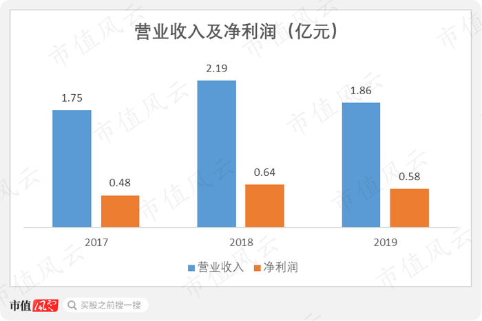 2017-2019年,公司营业收入分别为1.8亿元、2.2亿元和1.9亿元,2018年和2019年营业收入分别较上年同期增25%、降15%。