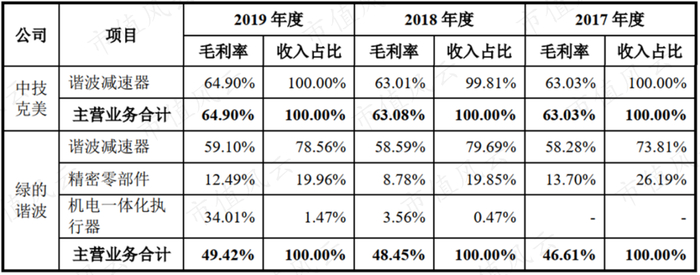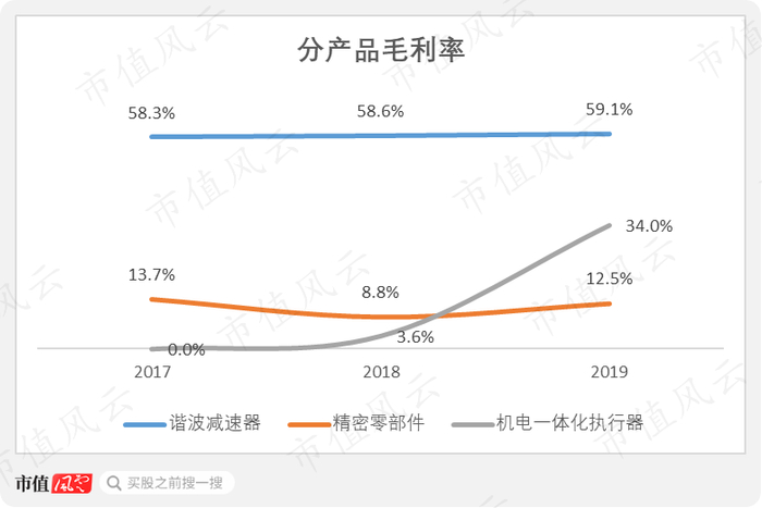 而核心产品谐波减速器的毛利率,公司与中技克美水平相近。以2019年为例,公司与中技克美的谐波减速器么毛利率分别为59%与65%。