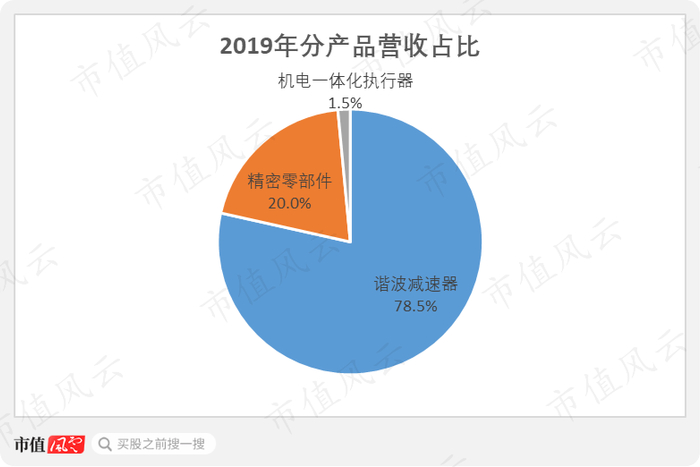公司核心产品是精密谐波减速器,2019年营收占比近80%,其下游应用的最大领域为工业机器人;另外一大产品类别为精密零部件,营收占比为20%。