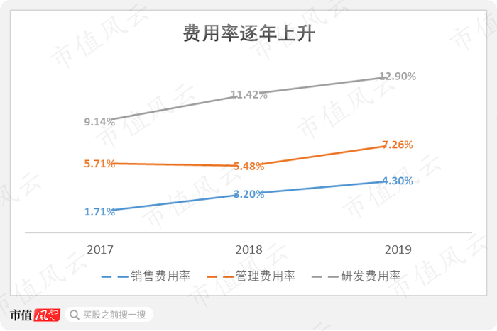 从销售、管理及研发费用率来看,2011-2019年,这三项费用率逐年上升。