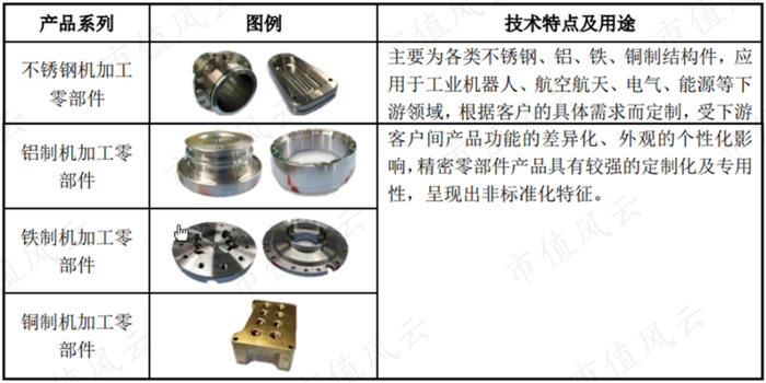 精密零部件主要为各类不锈钢、铝、铁、铜制结构件,应用于工业机器人、航空航天、电气、能源等下游领域。