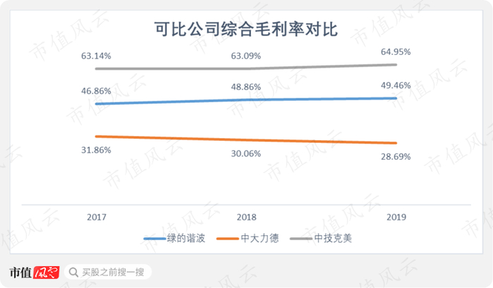 横向对比来看,2019年,公司综合毛利率低于可比公司中技克美近15个百分点,高于中大力德20个百分点以上。