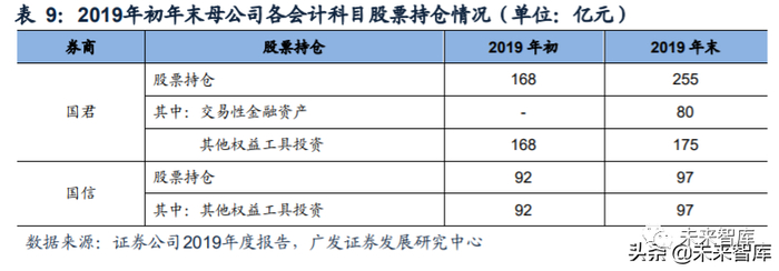 国君、国信在切换“新金融工具准则”后,母公司股票持仓主要核算至其他权益工 具投资中,该部分市值变动不影响损益,从而在2019年股市大幅上涨行情中收入偏 低。其中国君在2019年逐步提升权益投资规模,预计新开仓的股票持仓调整核算至 “交易性金融资产”中。