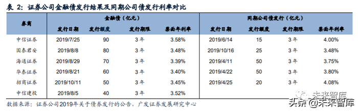 长期以来,政策性银行和商业银行是金融债券的主要发行主体,由于缺乏具体规范 文件,证券公司很少在银行间市场发行金融债。2019年6-7月,中信证券、国泰君安 等多家头部券商公告收到证监会监管意见书及央行许可,同意其申请发行金融债, 意味着证券公司金融债发行开闸。金融债松绑有助于扩大杠杆资金来源,中信证券、 国泰君安等7家头部券商共发行金融债440亿元。同时,金融债具有低利率的特征, 可进一步降低券商的融资成本,根据头部券商公告,金融债发行利率明显低于邻近 日期公司债的发行利率。