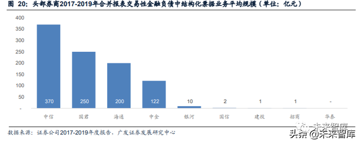中信一方面加大卖出回购力度进行债券投资,2017-2019年平均卖出回购平均规模 有1271万元;另一方面大力发行客户结构化票据,交易性金融负债规模462亿元(其 中结构化票据规模为370亿元);同时,中信衍生品业务具有显著优势,衍生金融工 具净额与衍生业务应收应付保证金净额(均为“负债-资产”)合计有128亿元。