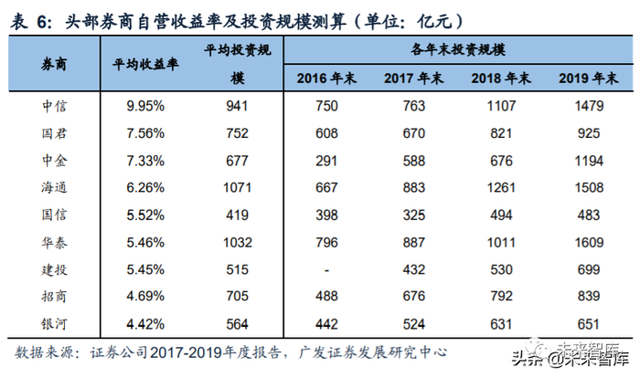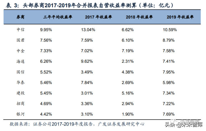 我们选取中信、国君、海通、华泰、招商、国信、建投、银河、中金9家头部券商作 为分析对象,对2017-2019年合并报表下的自营净收益率进行测算。