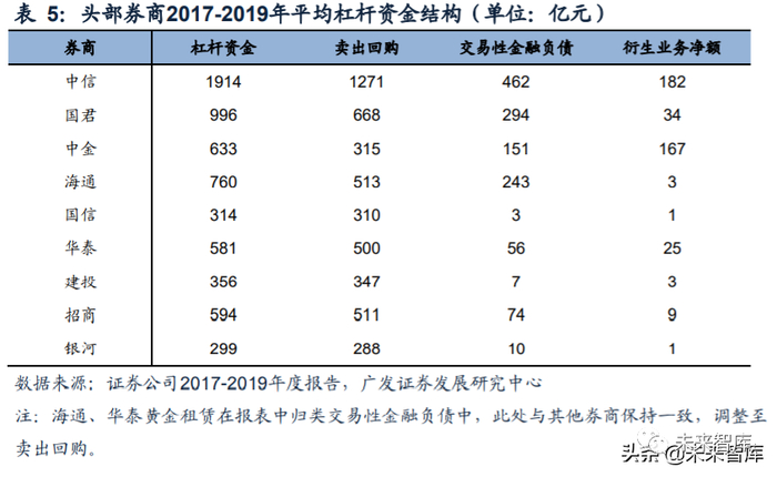 中金主要是衍生品业务优势突出,衍生业务资金净额规模167亿元;此外,结构性票 据在头部券商也处于靠前位置,交易性金融负债中约122亿元为结构化票据;中金卖 出回购规模小,债券杠杆资金偏低。