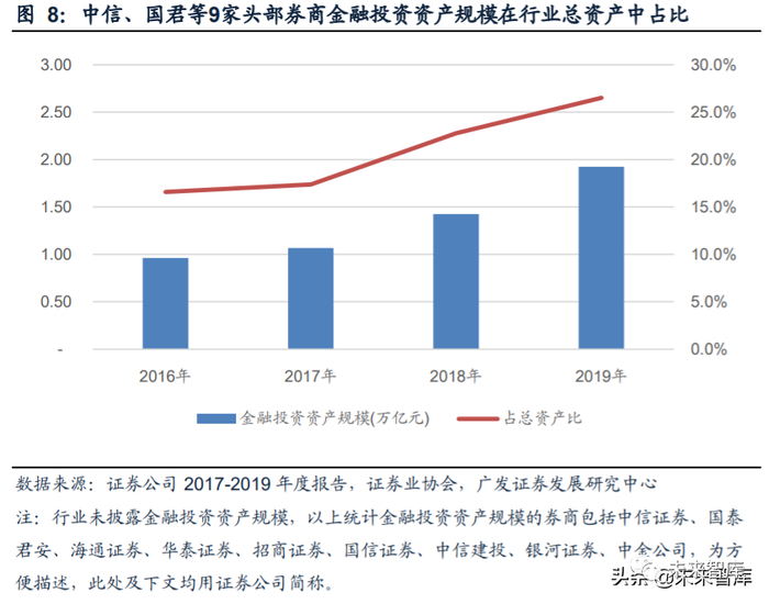因此,可以判断近几年增量杠杆资金主要投向自营业务。我们统计中信、国君等头 部券商近3年金融投资资产在行业总资产中占比,2016年-2019年呈逐年上升趋势, 2016末为19.2%,2019年末达29.2%。自营业务收入在行业总收入中占比也逐年增 长,2016年证券投资收益在行业收入占比为17.3%,2019年末为33.9%,若考虑2018 年后切换新金融工具准则、部分债券投资收益调整至利息收入的影响,2019年末自 营业务收入在行业收入中占比将超过40%。