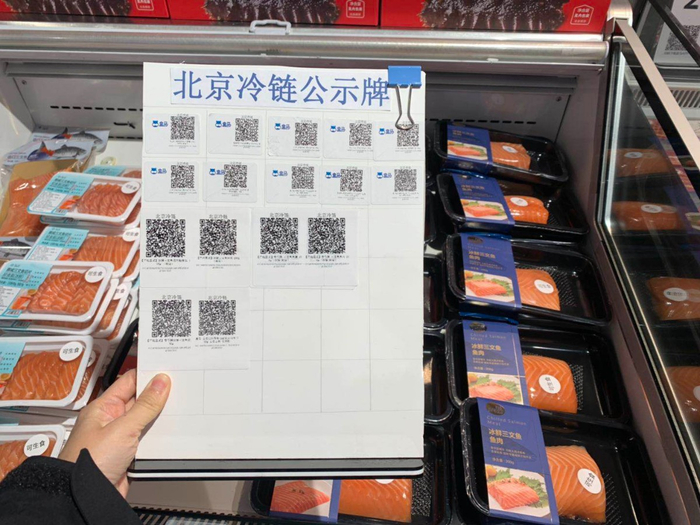 在盒马鲜生店内逛了一圈,记者发现,不少进口冷链食品都已经附上了“北京冷链”二维码。在存放冰鲜鱼的冰柜上,放置着一块“北京冷链”公示牌,牌子上用不干胶标签密密麻麻贴着16个火柴盒大小的二维码。冰鲜三文鱼腩、冰鲜三文鱼肉、冰鲜三文鱼尾、冰鲜三文鱼切片、去皮巴沙鱼柳……不同的商品都单独配备了独立的二维码。超市工作人员告诉记者,这些“北京冷链”二维码其实几天前,就已经提前准备好,张贴或是摆放在了冰柜上。“我们还做了一些改进,比如,最开始的时候,二维码全是用A4纸打印的,在冰柜上一个挨一个摆一大排,消费者不太方便扫描。后来我们就改成了公示牌这种形式,制作不干胶二维码标签,贴在公示牌上,一目了然又便于顾客扫描操作。”记者从市场监管部门了解到,同一个批次的产品只会使用一个二维码,产品生产批次号具有唯一性。