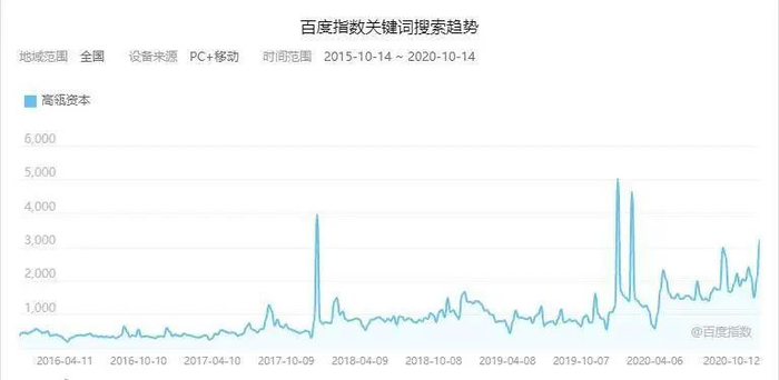 通过百度搜索指数,我们可以直观地看到,高瓴是如何一步步光环加身的。2017年底之前,高瓴的百度搜索指数只有一次超过了1000,但从2018年开始,这个数值一路上涨,最高达到5000,今年以来维持在2000左右。