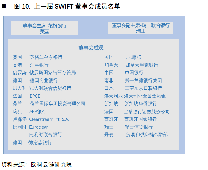 2012年3月SWIFT宣布停止对被欧美制裁的伊朗银行提供服务,让大众意识到SWIFT的重要性同时,也增加了对SWIFT过分依赖的担忧。然而,部分自媒体将SWIFT看成美国政府控制下的一个部门,这是完全错误的。事实上,SWIFT是一个非官方专业组织,其董事会由25位独立董事组成,任期三年。例如在2016年时,董事会由美国花旗银行的董事担任主席、瑞士瑞联银行的董事担任副主席,而来自中国的中国银行、香港的汇丰银行也在其中担任董事会成员。