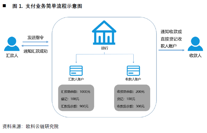在日常生活中,最简单的支付方式就是双方面对面地进行现金支付。然而对于进行跨境支付的用户而言,很难使用现金支付的方式。因此在现代金融体系中,我们都是通过金融账户来进行资金的收付。下图是一个简单的非现金支付示意图,基本过程如下: