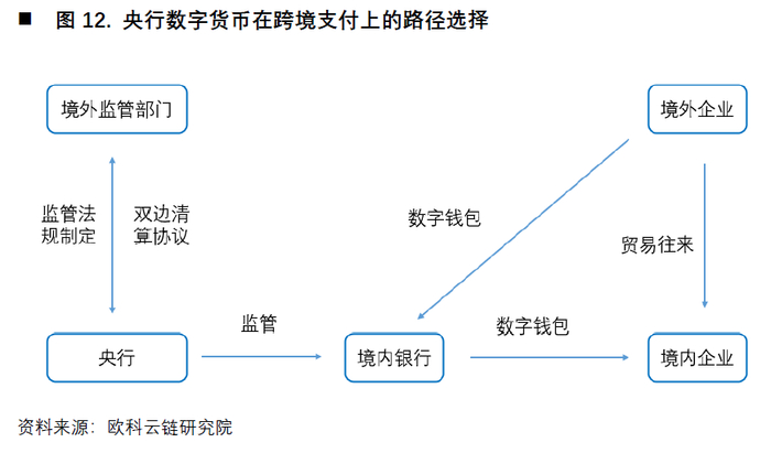 有所不同的是,在央行数字货币的语境下,没有账户的概念,而是只有数字钱包的概念。以DC/EP为例,由于DC/EP采用“双层运营体系”,因此境外企业可以注册安装由境内银行开发的央行数字货币钱包,而不需要境外银行的账户参与。当需要进行跨境支付时,由境内银行提供运营服务,直接将资金转入对方钱包,而央行负责日常监管。同时,为了防止资金通过该体系外流,可以设置额度管理。当然,在此条件下,如果境内外企业不通过SWIFT进行资金归集和集中调拨等跨境支付以及账单收取,那么将摆脱对SWIFT的依赖。