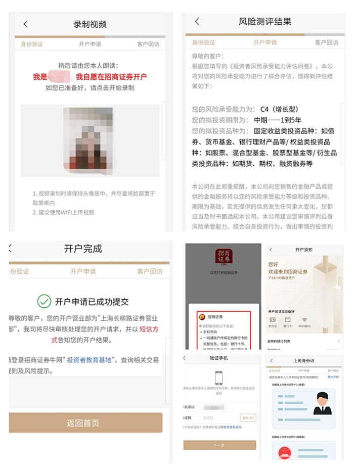 在开立账户时,网页要求进行手机验证,随后要求上传身份证,在身份验证环节,需进行视频录制,要求开立证券账户本人朗读“我是xxx,我自愿在招商证券开户”,随后进行了风险测评,选择市场等。开户完成页面显示“开户申请已完成提交”,并提示开户营业部为“上海长柳路证券营业部”。