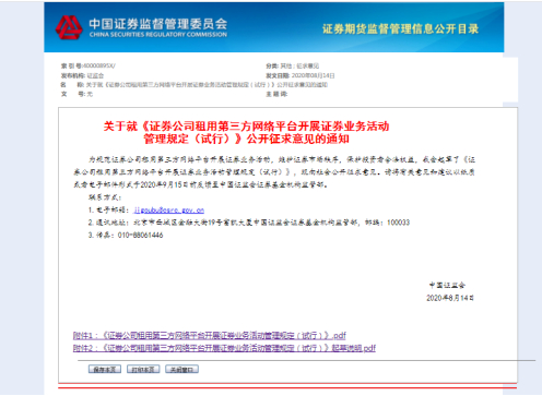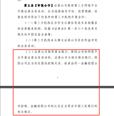 2020年8月14日,证监会起草了《证券公司租用第三方网络平台开展证券业务活动管理规定(试行)》并向社会公开征求意见,该规定第五条第三款显示,“证券公司租用商业银行、保险公司的网络平台开展证券业务活动的,证券公司与相关商业银行、保险公司应当存在股权控制关系,或者由同一金融控股公司控制。金融控股公司的认定应当符合中国人民银行的有关规定”。