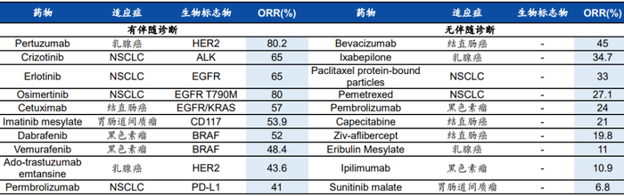 根据Jorgensen&Hersom在2016年的研究数据显示,过去15年内批准的靶向药物中,无伴随诊断的靶向药可观应答率(ORR)在6.8%-45%之间,而有伴随诊断的靶向药物可观应答率在41%-80.2%之间,说明伴随诊断可以显著提升靶向药物可观应答率。