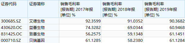 艾德生物核心业务检测试剂的销售毛利率一直维持在92%以上,说明公司的检测试剂产品的技术壁垒较高,议价能力较强。同时通过与国内分子诊断行业的可比公司比较,可以发现艾德生物的毛利率水平处于领先地位。
