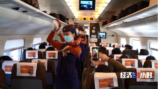 在车厢载歌载舞的列车乘务员