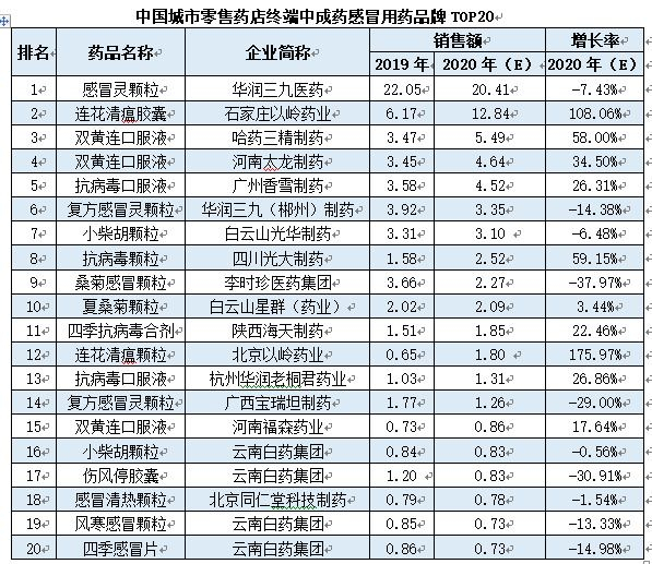 最新感冒中成药零售TOP20出炉!华润三九超20亿夺“销冠”