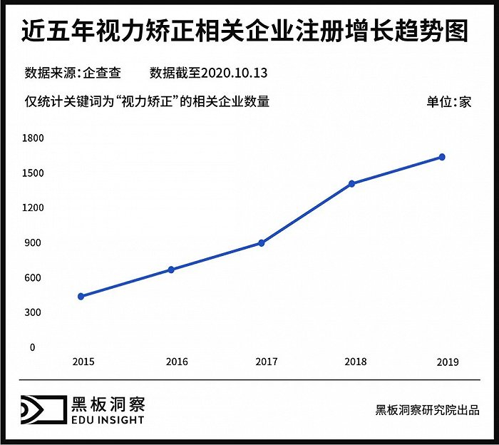 除了7亿数字带来的正面冲击外,换个角度看,悄然兴起的视力矫正机构也是近视人数与日俱增的印证。随着近年来青少年近视发病率逐年上升,各种视力矫正机构悄然兴起。企查查数据显示,截止2020年10月,我国共有企业状态为在业或存续的视力矫正相关企业0.51万家。此外,从2015年到2019年这5年中,视力矫正相关企业年注册量也在不断攀升,其中2015年注册量仅为438家,而到了2019年已达1643家,增长了近三倍之多。